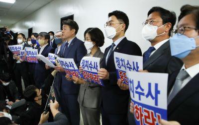 더불어민주당 내 강경파 모임 \'처럼회\' 소속 의원들은 이날 검찰의 민주연구원 압수수색 시도가 직권남용에 해당한다며 고위공직자범죄수사처(공수처)에서 이를 수사해야 한다고 촉구했다.