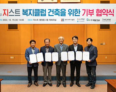 20일 지스트에 따르면 지난 19일 오후 행정동에서 `(가칭)지스트 복지클럽 건축을 위한 기부협약식\'을 개최하고 복지클럽 건축 추진에 ‘더나인건축사사무소’와 ㈜대담건설이 각각 설계와 시공에 참여하기로 했다.