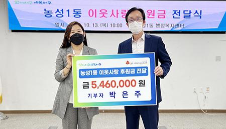 광주 서구 농성1동행정복지센터가 지난 13일 광주서부경찰서 박은주 경위와 이웃사랑 후원금 전달식을 가졌다.