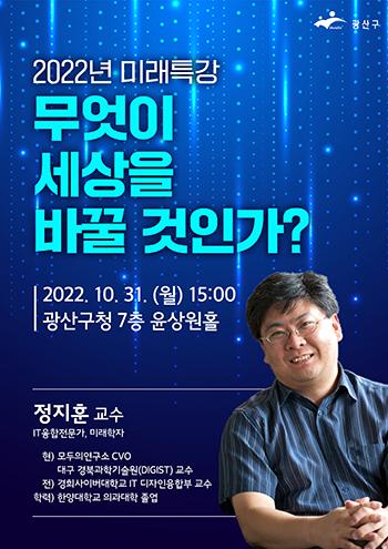 광주 광산구(구청장 박병규)는 31일 오후 3시 구청 7층 윤상원홀에서 정지훈 교수(IT융합전문가, 미래학자)를 초청해 ‘무엇이 세상을 바꿀 것인가?’라는 주제로 4차 산업혁명 기술 관련 미래특강을 개최한다고 밝혔다.