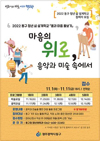 광주 동구(청장 임택)는 바쁜 일상 속 청년들에게 삶을 채우는 다양한 경험을 통해 자신을 깊이 탐색하고 스스로 삶을 계획해 볼 수 있는 ‘청년 삶 설계학교-마음의 위로, 음악과 미술 속에서’ 프로그램 참여자를 모집한다고 밝혔다.