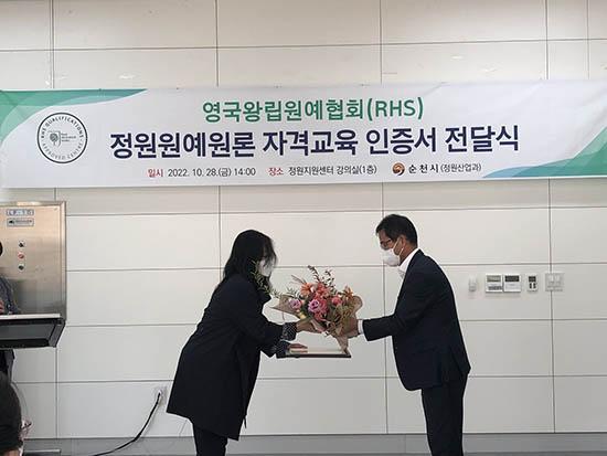 순천시는 지난달 28일 영국왕립원예협회(Royal Horticultural Society, 이하 RHS) 정원원예원론 자격교육 인증서 전달식을 가졌다고 밝혔다.