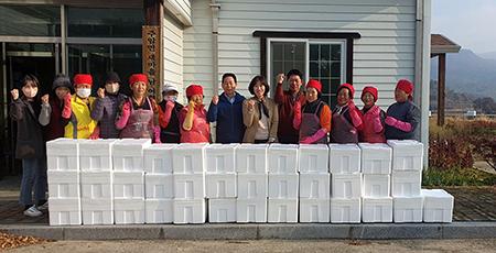 부녀회는 지난 16일 김치 나눔을 위해 이틀 전부터 배추 절이기, 물빼기, 양념 버무르기 등 공동작업을 했다.