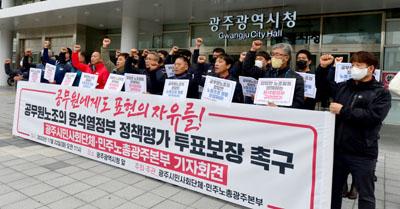 광주지역 시민사회 단체·민주노총 광주본부는 이날 오전 광주 서구 치평동 광주시청 앞에서 \'윤석열 정부 정책평가 투표 보장 기자회견\'을 열고 \"정부는 (투표에 대해) 법령 위반·징계를 운운하며 헌법에서 규정한 노조할 권리를 부정하고 있다\"며 이같이 밝혔다.