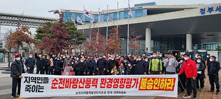 순천시 승주읍·월등면·서면 주민들로 구성된 순천 바랑산 풍력단지조성 반대 대책위원회가 풍력발전단지 건설사업의 전면백지화를 요구하며 지난 11월 29일 세종시 정부종합청사 앞에서 집회를 개최했다.