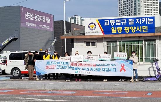 광양시는 지난달 30일 ‘제35회 세계 에이즈의 날(12월 1일)’을 맞아 중마동 버스터미널 일대에서 한국에이즈퇴치연맹 광주전남지회와 함께 에이즈 예방 및 감염인에 대한 사회적 편견과 차별 해소를 위한 ‘에이즈 바로 알기’ 거리 캠페인을 실시했다.