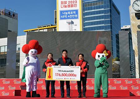 기아 오토랜드 광주(공장장 박래석)는 1일 \'사랑의 온도탑\' 첫 기부기업으로 참여해 1억7650만원을 전달했다고 밝혔다.