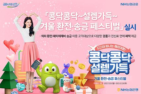 NH농협은행은 올겨울 해외여행과 유학 등을 준비하는 고객을 위해 \'콩닥콩닥~설렘가득~ 겨울 환전·송금 페스티벌\'을 실시한다고 5일 밝혔다. 이벤트 기간은 내년 2월28일까지다.