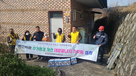 순천시 황전면마중물보장협의체(위원장 장택환)는 지난 5일부터 이틀간 어르신들의 낙상 사고 예방을 위해 저소득층 25가구 주택에 태양광 LED 보안등을 설치했다.