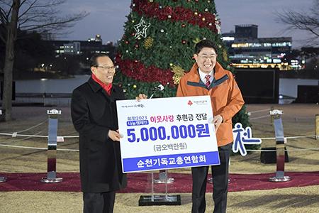 순천기독교총연합회가 이웃돕기 성금 500만 원을 순천시에 기탁했다. 기탁된 성금은 전남사회복지공동모금회를 통해 도움이 필요한 이웃에게 지원할 계획이다.