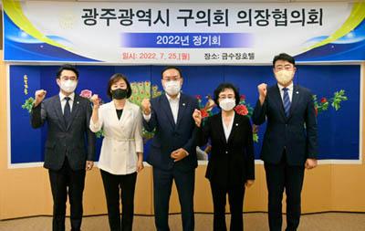 광주 5개 자치구의회 의장협의회. (사진 왼쪽부터) 김재식 동구의회 의장, 황경아 남구의회 의장, 김형수 북구의회 의장(협의회장), 고경애 서구의회 의장, 김태완 광산구의회 의장. /광주 북구의회 제공
