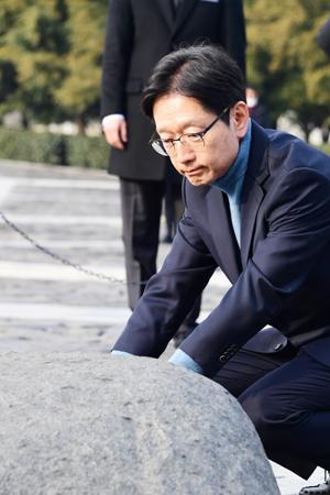 이날 오전 10시 경남 김해시 봉하마을 노 전 대통령 묘역에서 헌화 분향한 뒤 묵념했다.
