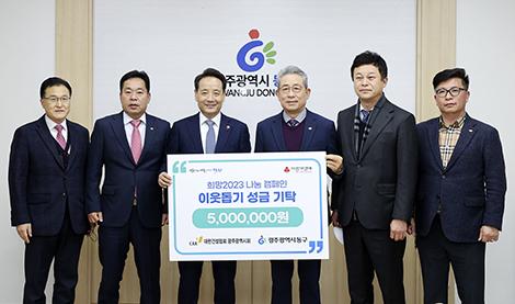 김영주 회장을 비롯한 대한건설협회 광주시회 임원진은 지난 27일과 28일 5개 자치구를 방문해 각각 500만원씩을 전달했다.