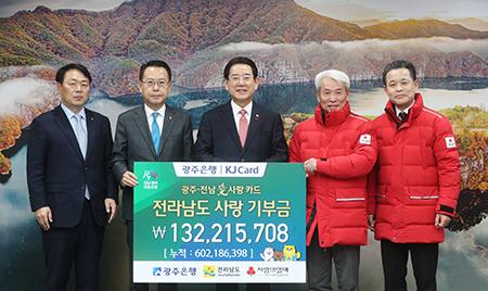 전남도는 29일 광주은행이 \'광주·전남애(愛) 사랑카드\' 성금액 1억3000만원을 기탁했다고 밝혔다.