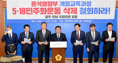 광주·전남 지역 국회의원 20명은 4일 광주시의회 기자실에서 긴급 기자회견을 열고 \"우리 아이들이 배우는 교육과정에서 5·18이 삭제된다면 민주주의 역사는 퇴색할 것이고 국민은 또 다시 분열하게 될 것\"이라며 \"\'5·18 삭제\' 조치를 즉각 철회할 것\"을 촉구했다.