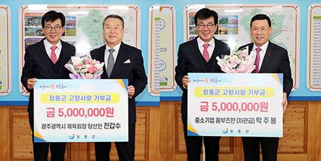 장흥군은 지난 17일 전갑수 광주시 체육회장 당선인과 박주봉 중소기업 옴부즈만(차관급)이 장흥군을 방문해 고향사랑기부금을 전달하는 등 많은 사람들이 장흥사랑 기부에 함께 동참하고 있다.