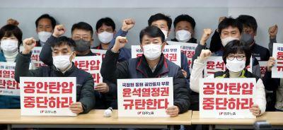 양경수 위원장 등 민주노총 관계자들이 19일 서울 중구 전국민주노동조합총연맹에서 기자회견을 열고 공안탄압 중단 촉구 및 국정원 동원 노동탄압·공안통치 부활 윤석열 정권을 규탄하고 있다. /뉴시스