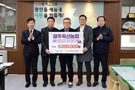 광주축산농협(조합장 김호상)이 19일 설 명절을 맞아 광산구(구청장 박병규) 소외계층에 온정을 전하기 위해 후원금 500만 원을 투게더광산 나눔문화재단에 기탁했다.