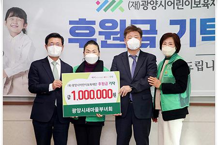 이번 후원금은 광양시 새마을부녀회 회원 일동이 지난 5월 지역 내 휴경지를 활용해 식재한 고구마를 10월에 수확해 판매한 수익금으로 그 의미가 깊다.