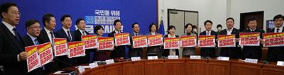이재명 더불어민주당 대표와 박홍근 원내대표 등 최고위원들이 1일 오전 서울 여의도 국회에서 열린 최고위원회의에서 손 피켓을 들고 구호를 외치고 있다.