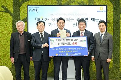 ‘도시가 정원이 되는 순천만 예금’이라는 특별한 상품 출시에 (재)순천만국제정원박람회조직위원회 노관규 이사장(순천시장)은 1일 순천만국제습지센터에서 제1호 상품(예금) 가입증서 전달식을 가졌다.