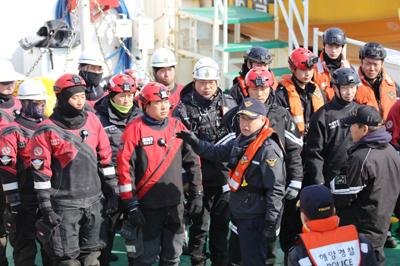 김종욱 해양경찰청장이 8일 신안 청보호 전복사고 현장지휘함인 해경 3015함에서 수색구조에 임하는 직원들을 격려하고 있다. /해양경찰청 제공