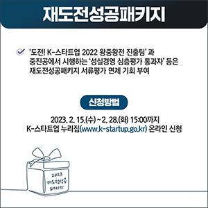 광주전남지방중소벤처기업청에 따르면, 중소벤처기업부와 특허청은 ‘2023년도 재도전성공패키지’ 사업에 참여할 (예비)재창업자를 2월 15일부터 28일까지 모집한다고 밝혔다.