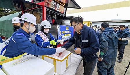 선급협회에서 직접 현장 작업자들에게 커피와 호빵 800인분을 나눠주며 안전한 작업을 통한 선박의 성공 건조를 당부했다.