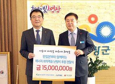 한빛원전은 최헌규 본부장이 영광군청을 방문해 강종만 군수에게 \'에너지 취약계층 난방비 지원\' 성금 1500만원을 전달했다고 22일 밝혔다.