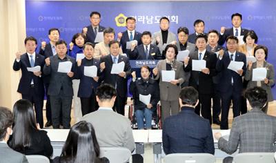 더불어민주당 소속 전남도의원들이 13일 오후 도의회에서 기자회견을 갖고 감사원의 한전에너지공과대학교 감사 중단을 촉구하고 있다. /도의회 제공