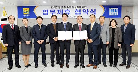 13일 이수화학과 \'흑하랑\'의 호주 생산과 판매를 위한 업무협약을 체결했다. 사진 가운데 좌측 이수화학 김동민 부문장, 우측 박홍재 전남농업기술원장. /=전남도 제공