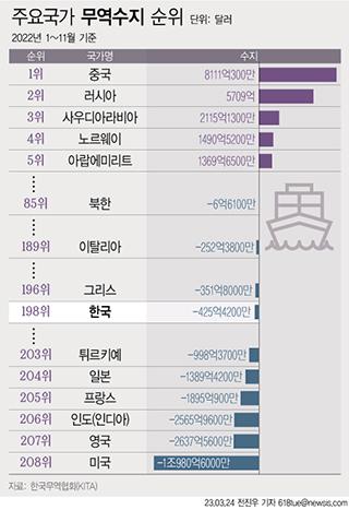 해당 기간 우리나라의 무역수지는 425억 달러 적자를 기록했는데, 12월에 적자가 심화하면서 누적 472억 달러까지 불어났다. 이를 고려하면 지난해 말 기준 순위는 이보다 더 떨어질 수 있다. 이미 지난해 3분기 말 194위에서 한 차례 밀려난 순위다.