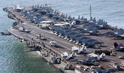 한·미·일 3국 훈련을 앞둔 미국 핵추진 항공모함 \'니미츠\'(CVN 68·10만t급)가 2일 오전 부산 남구 해군작전사령부 부산작전기지에서 출항하고 있다.
