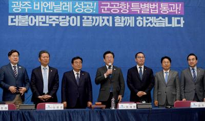 박홍근 원내대표는 \"민주당의 뿌리는 광주 정신에 있으며, 광주 시민이 쌓아온 민주주의가 바로 헌법 정신\"이라며 \"이제 민주당이 광주 시민 노고에 보답해야 한다\"고 말했다.