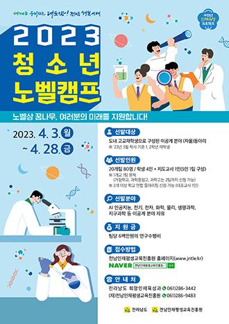 전남도는 관내 고교생을 대상으로 과학적 탐구와 창의적 문제 해결 능력 강화를 위해 \'2023년 청소년 노벨캠프\' 참여자를 모집한다고 12일 밝혔다.