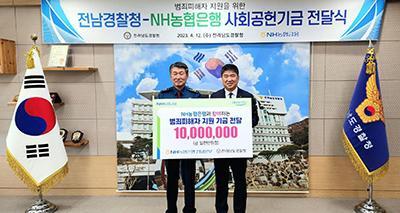 NH농협은행 전남본부는 12일 전남지방경찰청(청장 이충호)에 범죄피해자 지원 성금 1000만 원을 전달했다고 밝혔다.