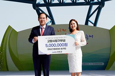 진도군 홍보대사인 송가인은 4년 만에 열린 제43회 진도신비의바닷길축제에서 고향사랑기부금 연간 최대 한도인 500만원을 전달했다.