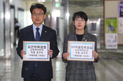 26일 진성준 민주당 원내 운영수석부대표와 장혜영 정의당 원내 수석부대표는 50억 클럽 및 김건희 특검 신속처리 안건 지정 요구서를 국회 의안과에 제출했다.