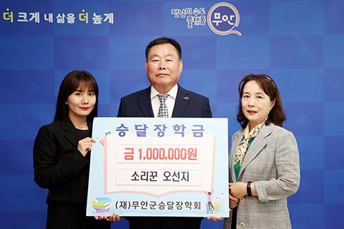 무안군(군수 김산)은 지난 2일 소리꾼 오선지 씨가 (재)무안군승달장학회에 장학금 100만 원을 맡겼다고 밝혔다.