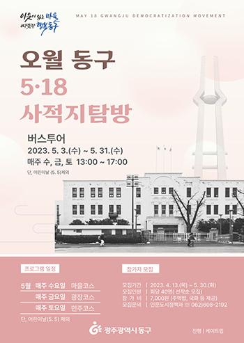광주 동구(청장 임택)는 제43주년 5·18민주화운동 기념일을 앞두고 5월 한 달간 ‘오월 동구 5·18 사적지 탐방’ 프로그램을 운영한다고 밝혔다.