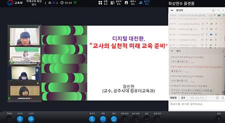 미래로 가는 AI교육 실현을 위해 AIEDAP(AI Education Alliance and Policy lab)분야 전문가인 국립공주대 인공지능융합교육연구소 강신천 소장를 강사로 위촉했다. 또 2023년 새롭게 개통된 차세대 지능형 연수 플랫폼인 ’배움누리터 실시간 화상연수‘ 시스템으로 연수를 운영한다.