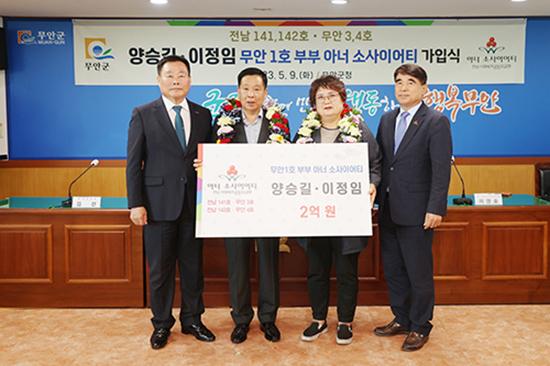 무안군은 양승길(제이개발(주) 회장), 이정임 부부가 9일 고액 기부자 모임인 아너 소사이어티 회원으로 가입했다고 밝혔다.