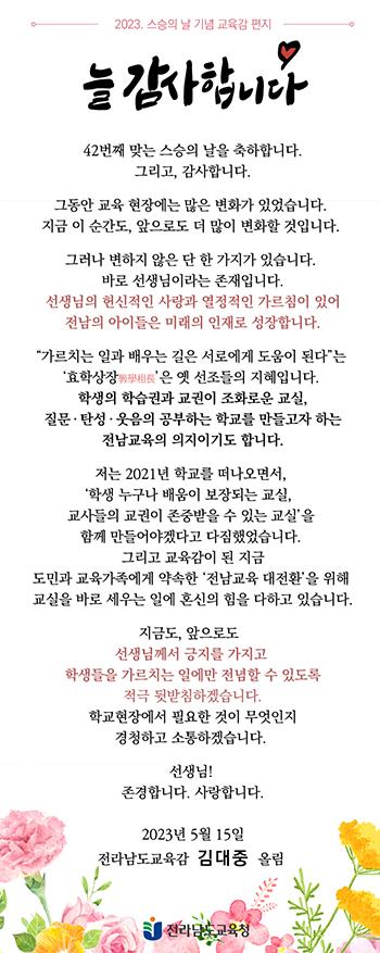 전남도교육청이 15일) 제42회 스승의 날을 맞아 전남 지역 교사들에게 감사의 메시지를 담은 서한문을 보냈다.