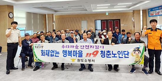 119청춘노인단은 완도군내 각 마을 안전지킴이를 양성하여 주민 자율 안전관리를 강화를 목적으로 완도소방서를 통해 화재예방 안전교육을 받아 완도 3읍 9면의 마을 주민으로 조직되어 운영 중이며 ▲소각행위·산불화재 감시 등 마을 화재 예방 순찰 ▲산불 예방 위한 논·밭두렁 소각 금지 홍보 및 캠페인 ▲ 화재 시 소방차 도착 전 초기대응 등을 수행하고 있다.