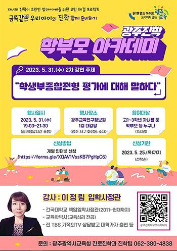 광주시교육청은 오는 31일 오후 7시 광주교육연구정보원에서 \'학생부종합전형 평가에 대해 말하다\'라는 주제로 제2차 광주진학 학부모 아카데미 특강을 개최한다고 23일 밝혔다.