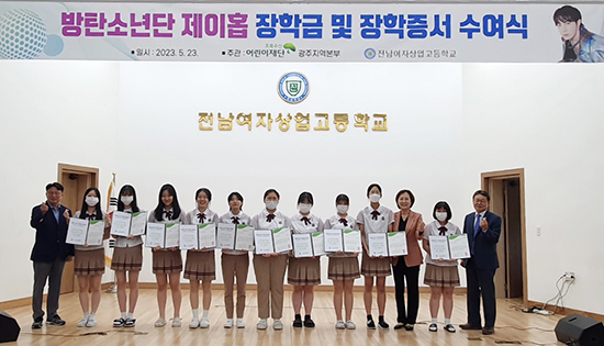 전남여자상업고등학교가 지난 23일 교내 우주동인관에서 ‘방탄소년단(BTS) 제이홉 장학금’ 수여식을 개최해 장학금과 장학증서를 전달했다.