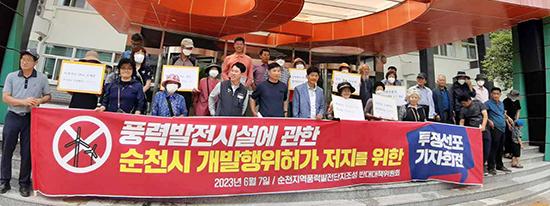 순천지역풍력발전단지 조성 반대대책위원회(이하 반대대책위)는 7일 오전 순천시청 앞에서 풍력발전시설에 관한 순천시 개발행위허가 저지를 위한 투쟁선포 기자회견을 열고 “풍력발전기 이격거리 2㎞ 조례를 무시한 순천시 개발행위허가가 절대로 일어나서는 안된다”고 강조했다.