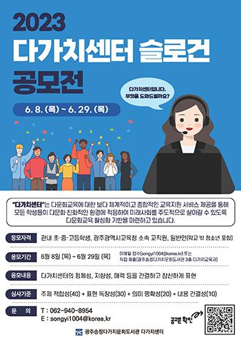 광주송정다가치문화도서관이 광주시교육청 다문화 교육 홍보와 다문화 친화적인 환경 조성을 위한 ‘다가치센터 슬로건 공모전’을 개최한다고 7일 밝혔다.