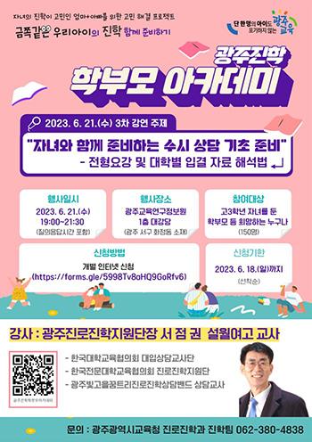 광주시교육청이 오는 21일 19시에 ‘자녀와 함께 준비하는 수시 상담 기초 준비’라는 주제로 제3차 광주진학 학부모 아카데미 특강을 개최한다. 장소는 시교육청 옆 교육연구정보원 1층 대강당이다.