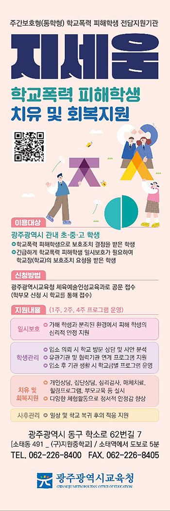 교육 대상은 학교폭력 피해 자녀를 둔 초·중·고 학부모, 학교폭력 예방과 대처에 관심이 있거나, 자녀 양육에 코칭이 필요한 학부모이다. 신청 방법은 학교폭력전담지원기관 ‘지세움’에 전화(062-226-8400~3)해서 신청하면 된다.